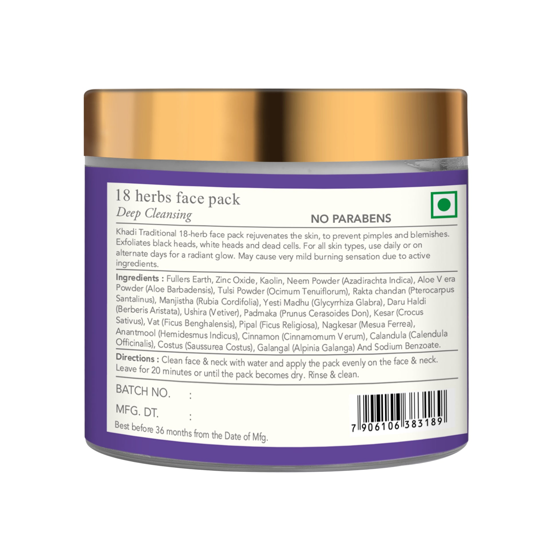 Ingredientes: tierra de batán, óxido de zinc, caolín, polvo de neem (Azadirachta Indica), polvo de aloe vera (Aloe Barbadensis), polvo de Tulsi (Ocimum Tenuiflorum), Rakta chandan (Pterocarpus Santalinus), Manjistha (Rubia Cordifolia), Yesti Madhu (Glycyrrhiza Glabra) ), Daru Haldi (Berberis Aristata), Ushira (Vetiver), Padmaka (Prunus Cerasoides Don), Kesar (Crocus Sativus), Vat (Ficus Benghalensis), Pipal (Ficus Religiosa), Nagkesar (Mesua Ferrea), Anantmool (Hemidesmus Indicus), Canela (Cinnamomum Verum), Calandula (Calendula Officinalis), Costus ( Saussurea Costus), Galangal (Alpinia Galanga) y Benzoato de Sodio.