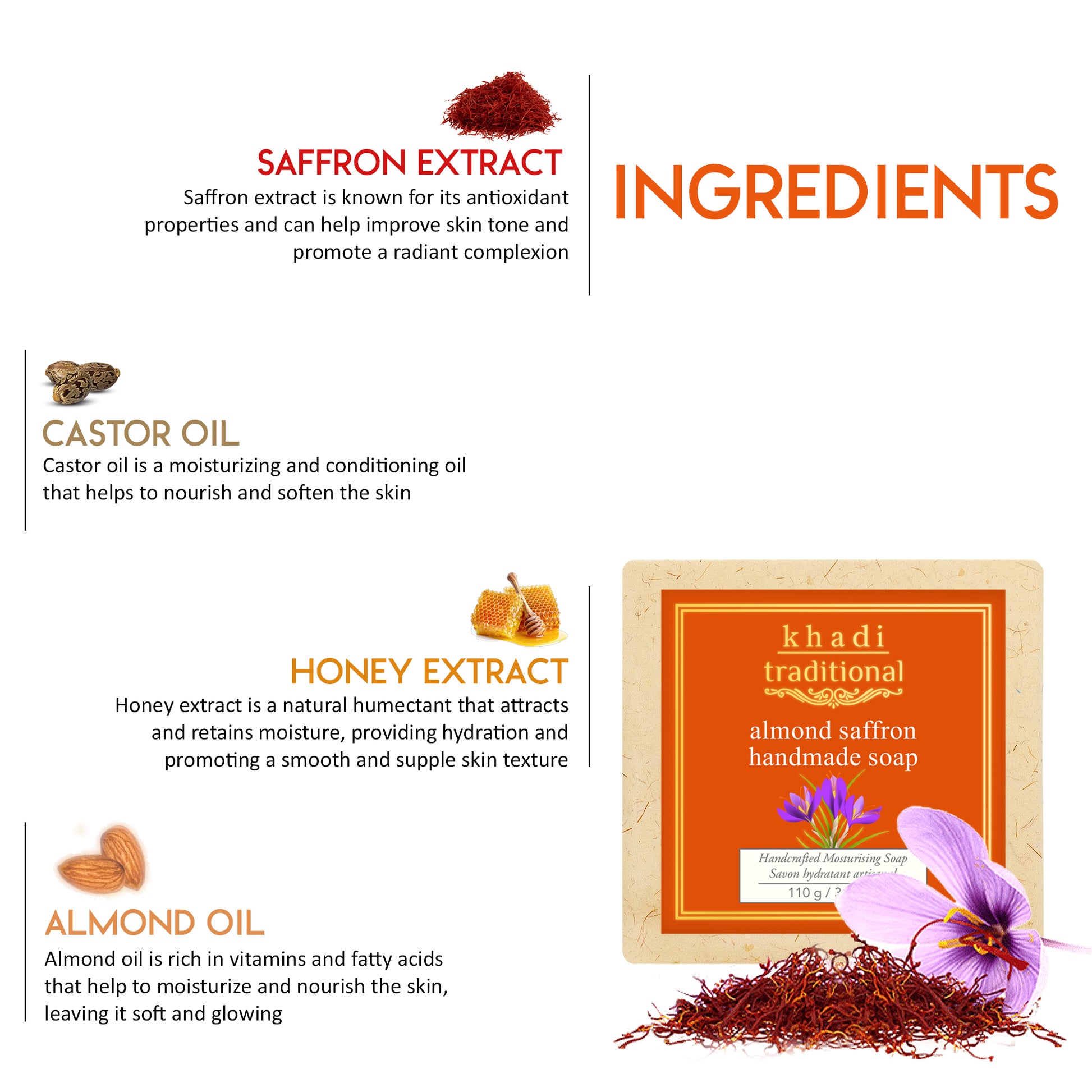 Ingredientes: Lauroil sarcosinato de sodio, estearato de sodio, cera de abejas (Cera Alba), ácido esteárico derivado del aceite de salvado de arroz, aceite de ricino (Ricinus Communis), aceite de almendras (Prunus Dulcis), hebras de azafrán (extracto de flor de Crocus Sativus), miel pura (Apis Mellifera), glicerina, sorbitol, dióxido de titanio y aceite aromático.
