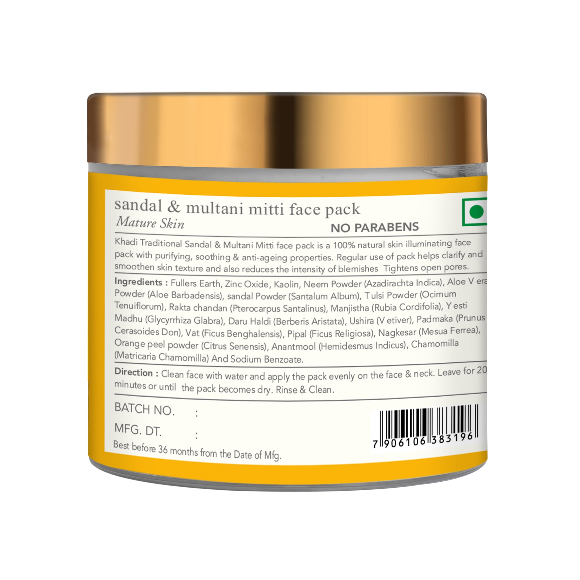 Ingredients : Fullers Earth, Zinc Oxide, Kaolin, Neem Powder (Azadirachta Indica), Aloe Vera Powder (Aloe Barbadensis), sandal Powder (Santalum Album), Tulsi Powder (Ocimum Tenuiflorum), Rakta chandan (Pterocarpus Santalinus), Manjistha (Rubia Cordifolia), Yesti Madhu (Glycyrrhiza Glabra), Daru Haldi (Berberis Aristata), Ushira (Vetiver), Padmaka (Prunus Cerasoides Don), Vat (Ficus Benghalensis), Pipal (Ficus Religiosa), Nagkesar (Mesua Ferrea), Orange peel powder (Citrus Senensis), Anantmool (Hemidesmus Indicus), Chamomilla (Matricaria Chamomilla) and Sodium Benzoate.